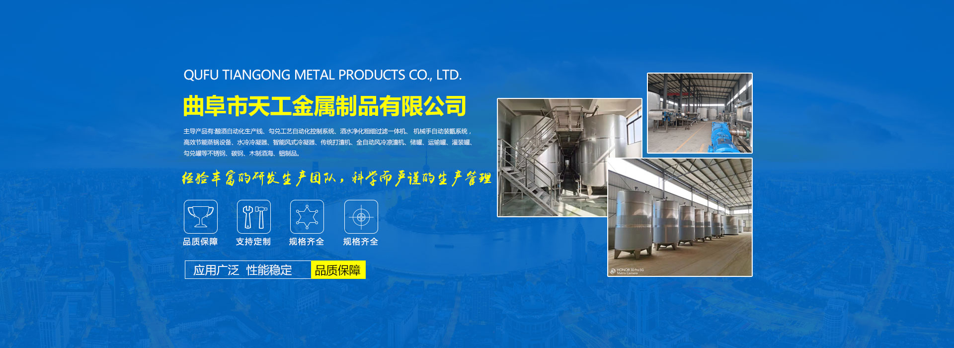 公司擁有功能齊全的化驗室、試驗室,一支高水平的設(shè)計研發(fā)團隊。機械設(shè)備、激光切割機、激光焊接機、數(shù)控機床、數(shù)字加工中心,氬弧焊、電氣焊、等離子切割機一應(yīng)俱全。技術(shù)力量雄厚,有釀造設(shè)備專家3名,工程師5名,大專學歷15名,中專學歷50名,員工全部持有由勞動技術(shù)部門,考核頒發(fā)的中級以上技術(shù)證書。公司配有嚴格的質(zhì)量管理保證體系。通過了ISO9000質(zhì)量體系認證,ISO9001質(zhì)量管理體系認證,獲得多項國家發(fā)明專利和實用新型專利。